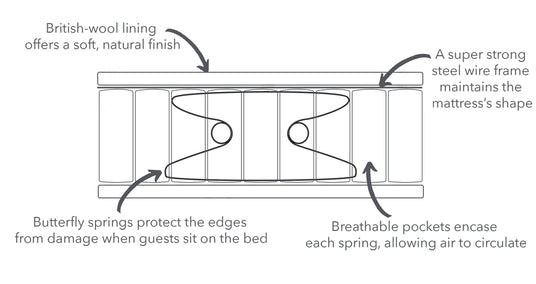 A steel flat wire frame around the mattress edges is supported by butterfly springs, which prevents damage - as we know, guests tend to sit on the sides of the bed. A Cheviot wool fill and lining surrounds the springs and is encased in a pure viscose outer fabric. These high-quality, natural materials ensure both breathability and temperature regulation, and are held in place by rosette tufts for added durability.