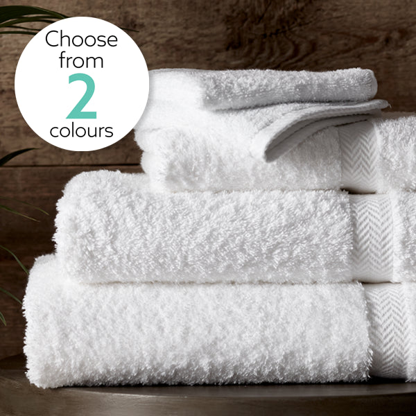 Elegant 500gsm white towels made from 100% certified sustainable organic cotton, with piped header bars.
