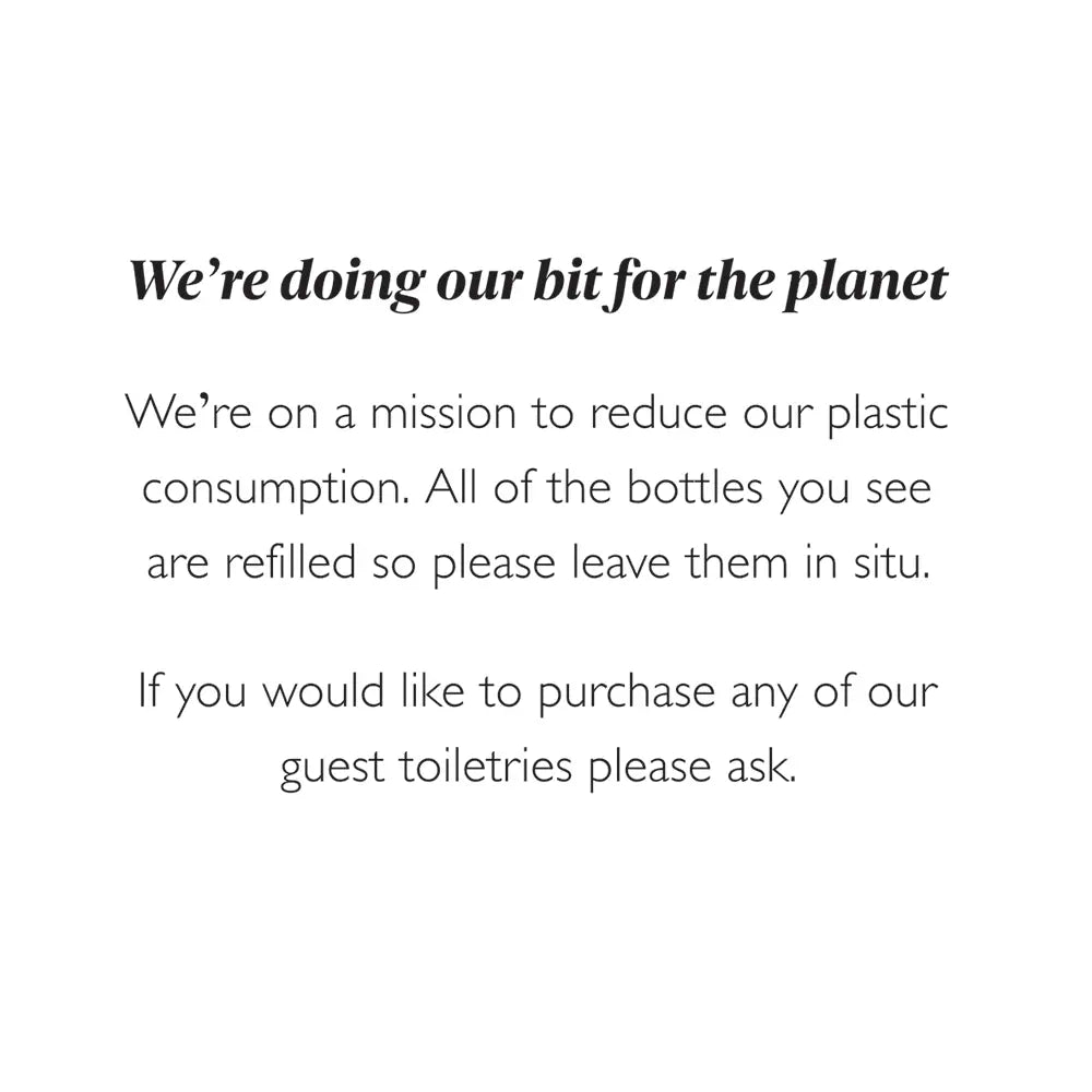 ‘We’re doing our bit for the planet. We’re on a mission to reduce our plastic consumption. All of the bottles you see are refilled so please leave them in situ. If you would like to purchase any of our guest toiletries please ask.’
