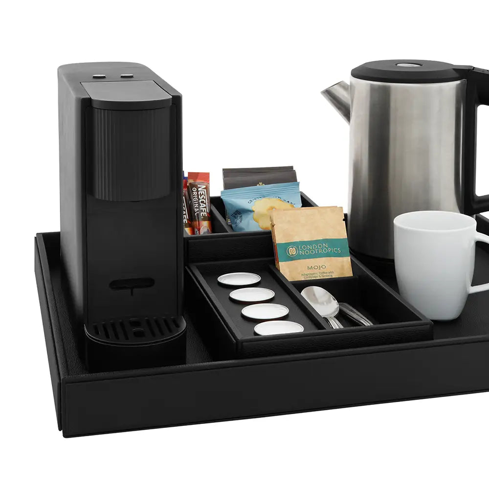 The Faux Leather Large Room Tray in black is a luxurious and refined addition to any upscale hotel guestroom. Crafted from premium Luxury PU leather, this tray combines elegance with lasting durability. Offering a stylish and practical solution for guestroom organisation. With raised sides for enhanced stability and ease of use, this effortlessly merges functionality with sophisticated design, elevating the guest experience to unparalleled luxury.