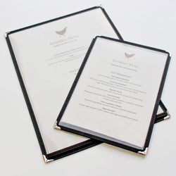 Present A4 menus in cafes, hotel dining rooms and B&Bs with this smart and practical menu holder. 'Menu' is printed in silver writing on the imitation black leather cover which is also easy to keep clean and sanitise quickly. Additionally, the front and back of the holder are strengthened with panelling, making it perfect for daily usage. The silver gilt corners are there to protect the holder and its contents from daily wear.