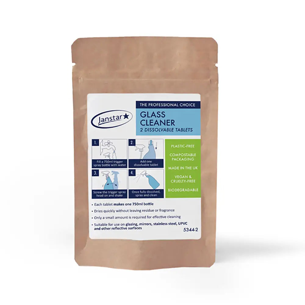 Designed for commercial use, these Janstar Glass Cleaner Dissolvable Tablets are the perfect addition to any cleaning trolly. Their compact packet means they take up next to no room to store and once used the packaging is fully compostable.