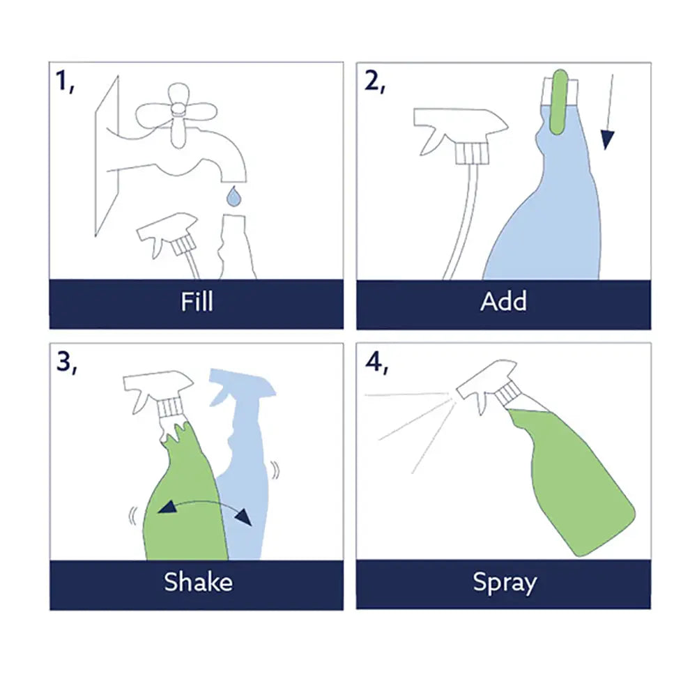 To use, fill a 750ml trigger spray bottle with water, add tablet, shake until dissolved, spray!
